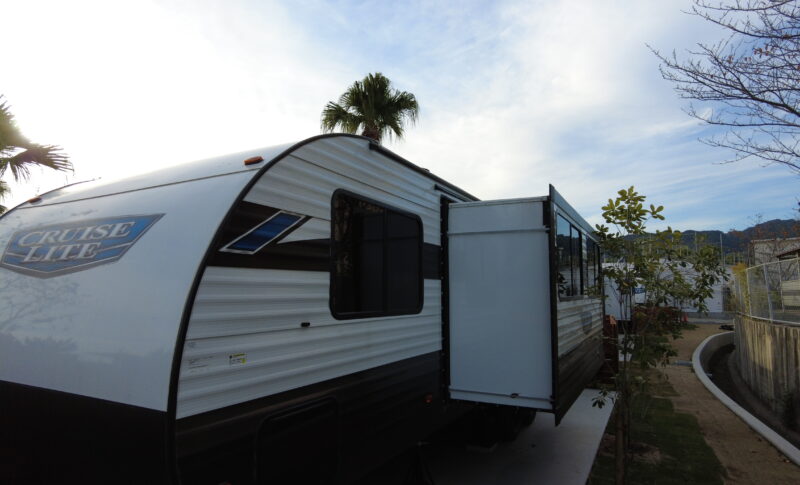 ヤシの木に囲まれ、夜にはガス灯が灯るリゾート感あふれる快適なトレーラーハウスと