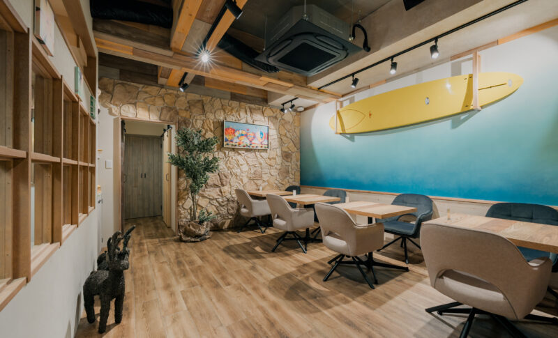 施設内には、4つのテラスやドッグエリア、ヤシの木のブランコがあり大人から子供まで楽しめ、