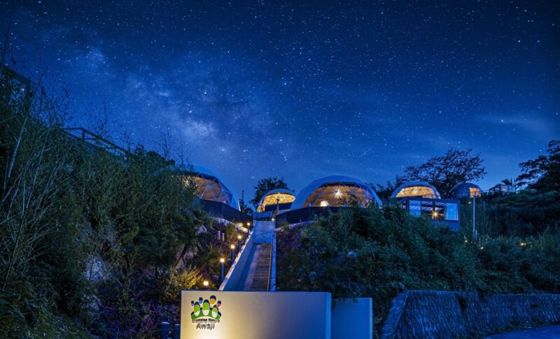 兵庫県淡路市の「グランピングリゾート Awaji」では、全室オーシャンビューのグランピング宿泊と姉妹施設「+Lei Kitchen」での3時間食べ放題&飲み放題を組み合わせた5周年記念プランを限定発表しています。