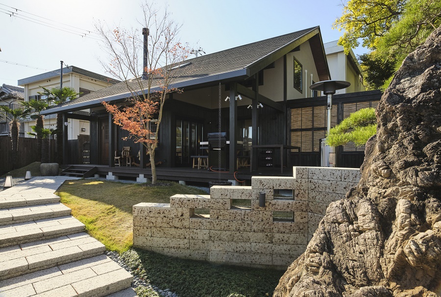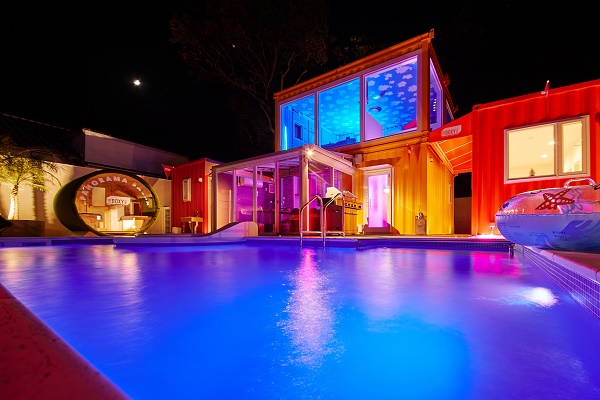 プール・サウナ・ジェットバスが付いたひときわ目立つ外観と、遊び心がいっぱいのアメリカンスタイルの一棟貸切(最大定員8名)
